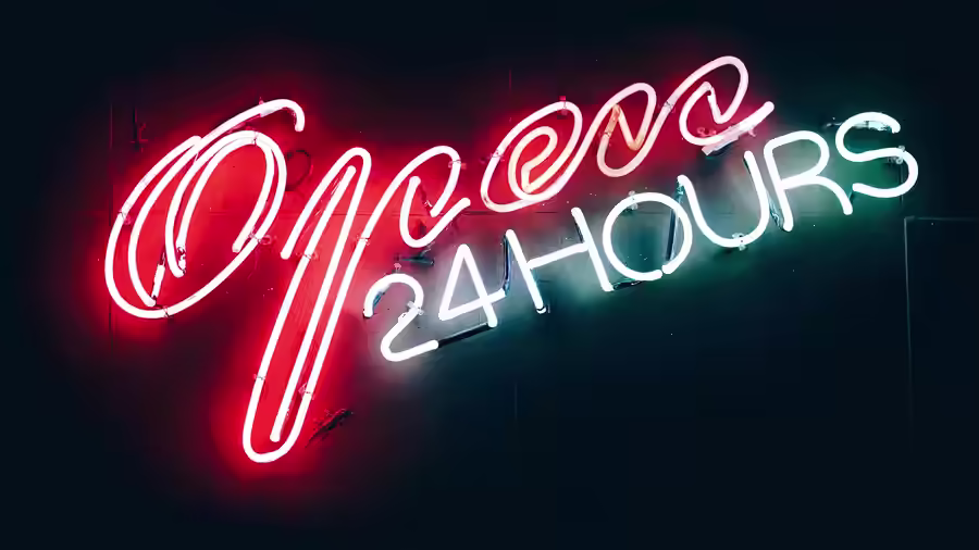 Банер за вътрешни страници с неонов надпис "Open 24 Hours" – символ на непрекъснато обслужване и модерен стил.