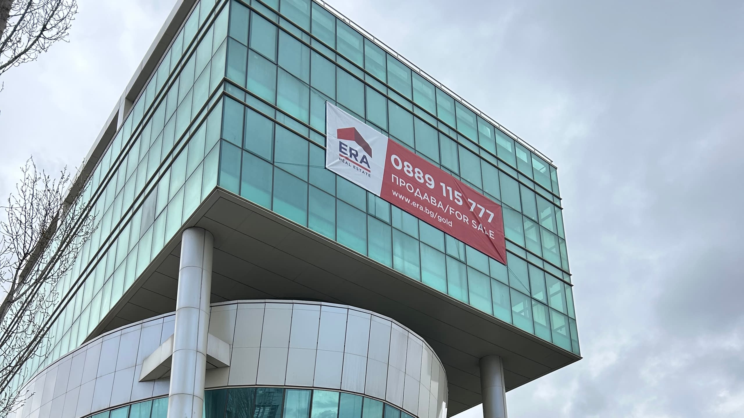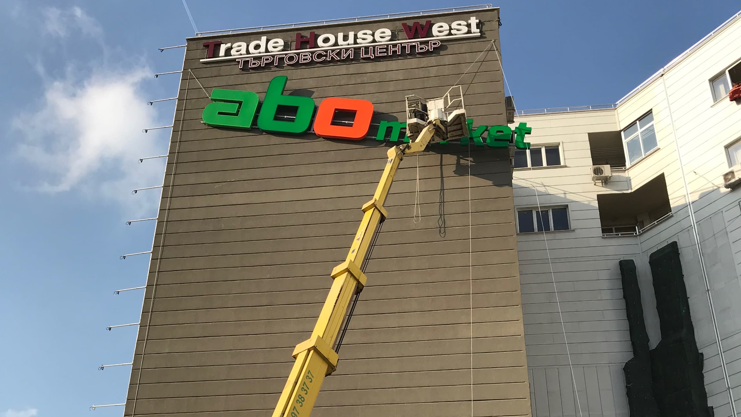 Монтаж на фасаден рекламен елемент с подемна техника върху модерна бизнес сграда от екипа на ХОРОС 5.