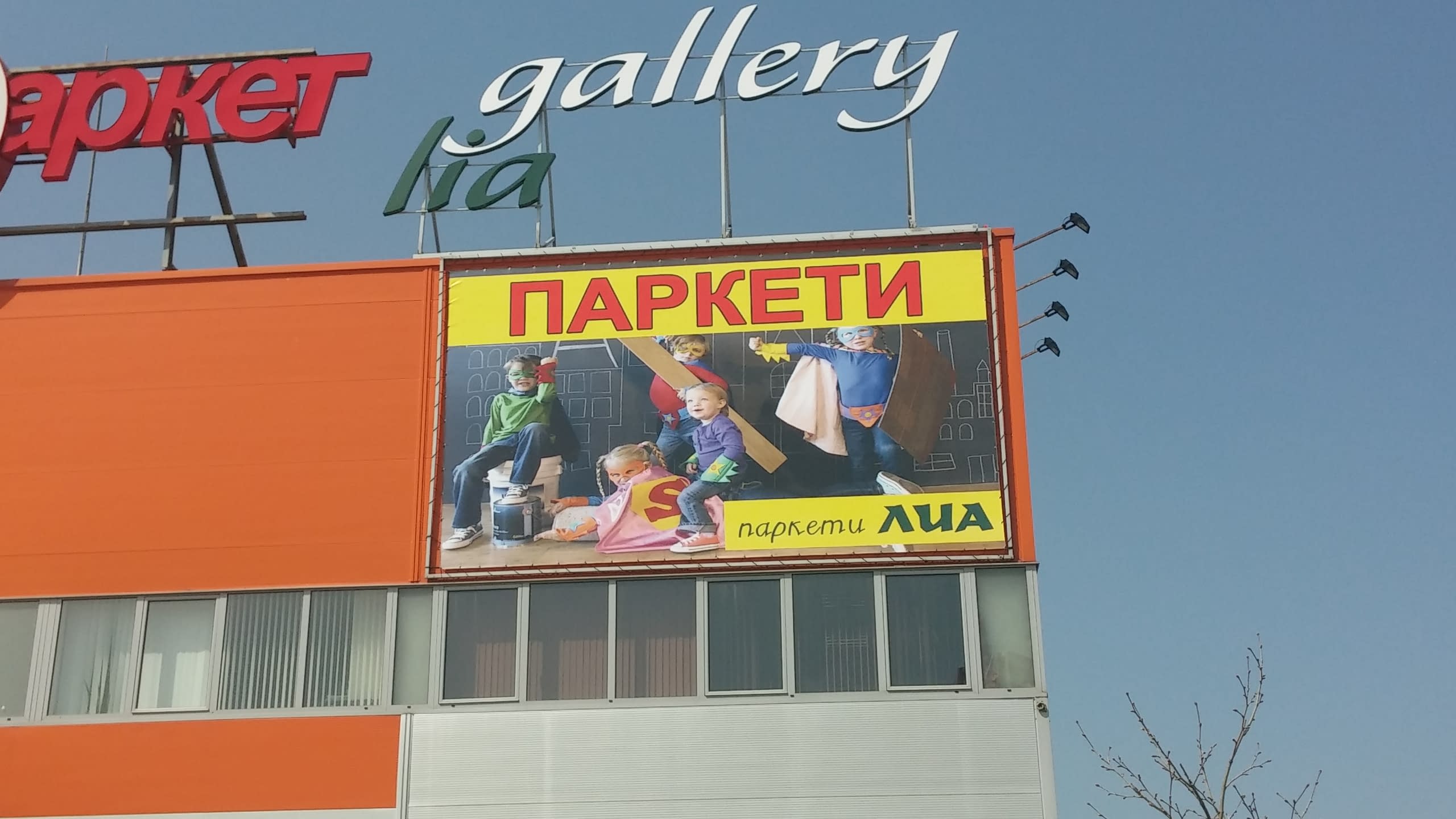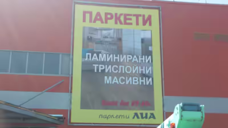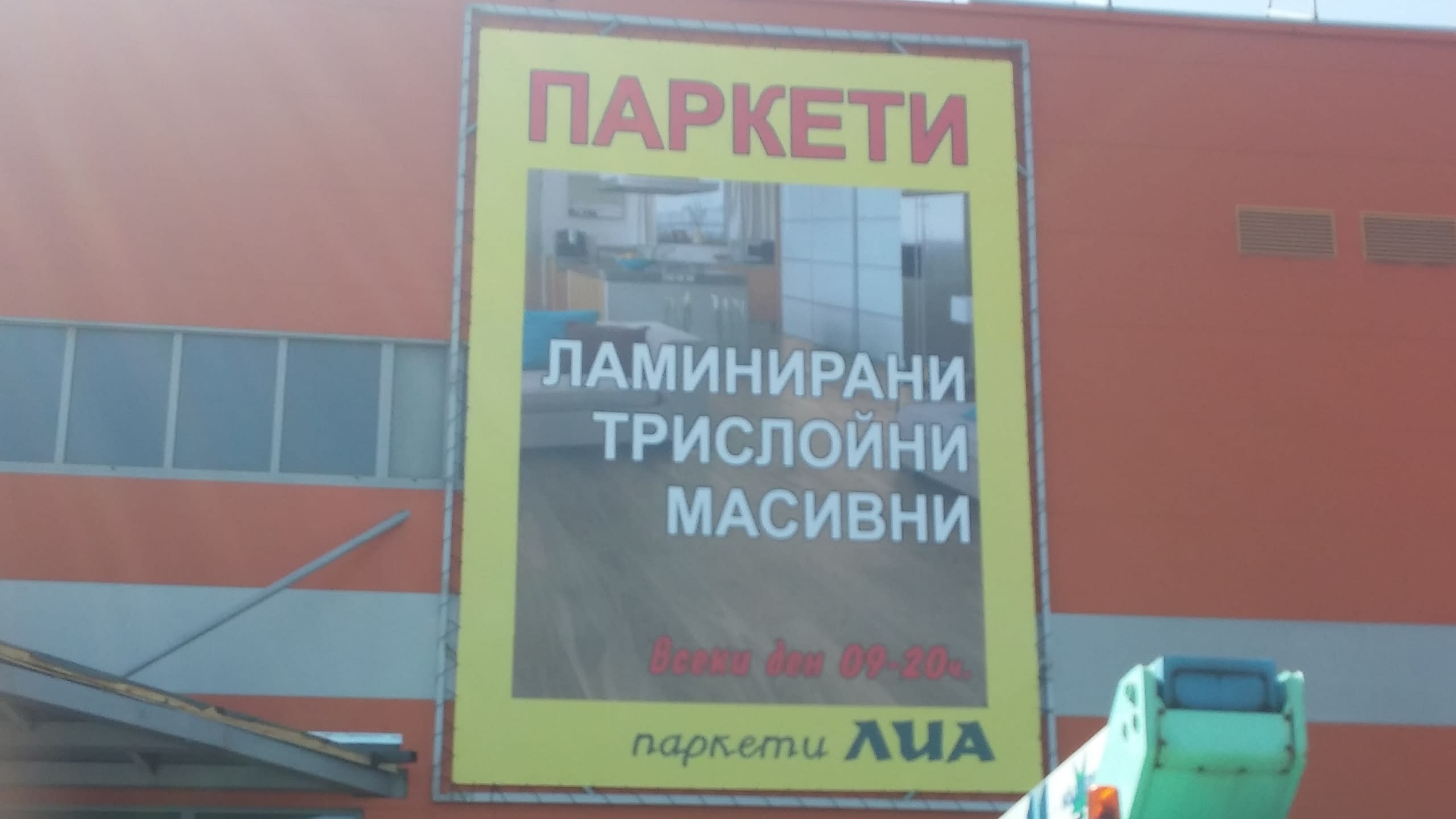 За големите рекламни пана, които виждаме по фасадите на сградите, най-подходящо е да се използва винилно платно. Винилът е изключително издръжлив на външни условия, особено на поривите на вятъра. Освен това е идеална медия за отпечатване на изображения с голяма площ. При това качеството на изображението е много високо. При използване на подходящи мастила, можете да се радвате на фотореалистично изображение, което е дълготрайно и надеждно от рекламна гледна точка. Самата реклама се изработва бързо и е сравнително евтина, но монтажът на платната на голяма височина е това, което изисква повече внимание и подготовка. При представената реализирана поръчка монтажът на транспаранта от винил бе ключовият момент по работата върху рекламата, тъй като трябваше да бъде монтиран на фасадата на голяма височина. Такъв монтаж винаги налага използване на метална конструкция, върху която да бъде опънато винилното платно. Възможностите за захващане на винила към конструкцията са няколко: чрез ластично въже, чрез джобове, чрез капси, или с използване на комбинация от повече елементи за монтаж. В случая паното е опънато с помощта на ластично въже, за да се обират всички движения на вятъра, с което се предотвратяват резките удари на рекламната табела във фасадата на сградата и евентуалното скъсване или повреждане на платното. Тъй като височината, на която трябва да се постави паното, е голяма, бе използвана техника при монтажа. Използваната техника е автовишка. Тя идва на помощ при големи височини до към 30 метра. При по-ниско позициониране на платното, до 7 метра, монтажът се прави със скеле. С автовишка постанянето на рекламата е сигурно, бързо и надеждно, както и довършителните операции по рекламната площ.