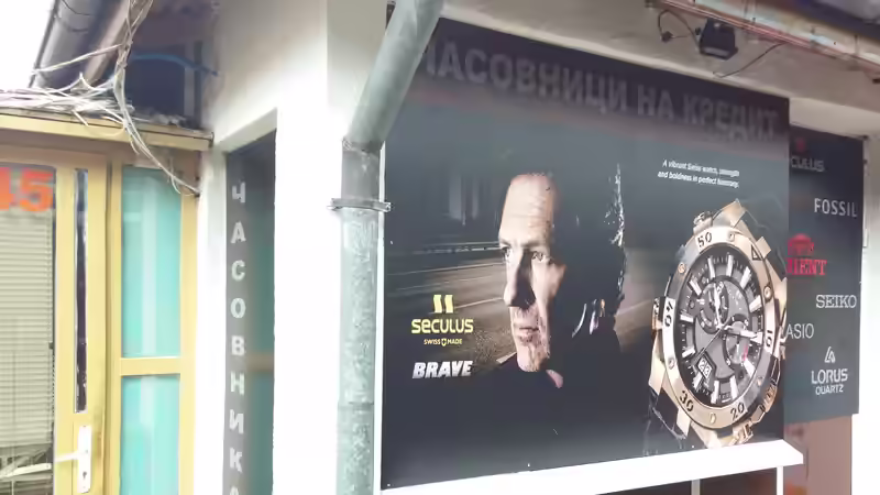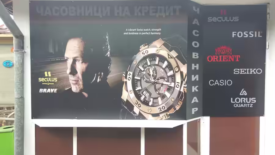 Всяка фирма с предмет на дейност рекламни продукти, най-често изработва рекламни табели от несветещ тип. Те са търсени много, защото са бързо и бюджетно решение за външна реклама. Табелата, която представяме на вниманието ви, е с безупречна линия, приятна визия и отлични показатели по отношение на здравина и устойчивост. Това е постигнато чрез използване на правилно подбрани материали за изпълнение при тази рекламна площ. За основа е използван композитен материал. Композитите не се влияят от външни атмосферни условия и се отличават с устойчивост на неблагоприятни въздействия. Това се дължи на основната им характеристика – направени са от два или повече съставни материала с различни свойства, като новият материал съчетава качествата на съставните и се отличава най-вече с якост и лекота, което му дава неограничено поле за приложение. Изображението е направено с помощта на фолио, на което е нанесен печат. Техниката на печатане с пълноцветен широкоформатен печат е много подходяща при апликиране на табели за външна, а и за вътрешна реклама, защото разполага с предимства като бърза изработка, достъпна цена, издръжливост на външни условия. Самото изображение е с фотореалистично качество, когато се използва висока резолюция на печат и качествени медии и мастила. Тази техника е подходяща и при фолиране на витрини, брандиране на автомобили, за декорация и много други приложения. На представената рекламна табела е положен и защитен слой ламинат, с който се предпазва печата на картинката от избледняване. Това е водещо условие при изработката на рекламната табела, изпълнена за външна реклама. Логата на марките часовници, които са поставени, са изпълнени от рязано цветно фолио, със спазени строго размер и шрифт на марката, както и запазен цвят, разпознаваем за всяка конкретна марка. Цветовете, избрани за фон и за изображения и надписи, контрастират и това допринася за постигане на максимална яснота, с което рекламната табела се отличава, и привлича вниманието на клиентите към обекта.