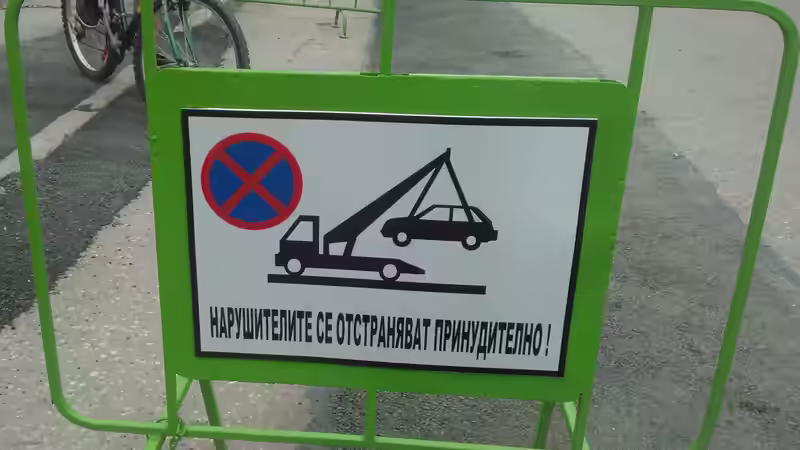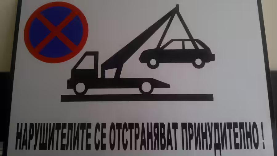 Табела със знаци за забранено паркиране и репатриране с паяк, и предупредителен надпис.