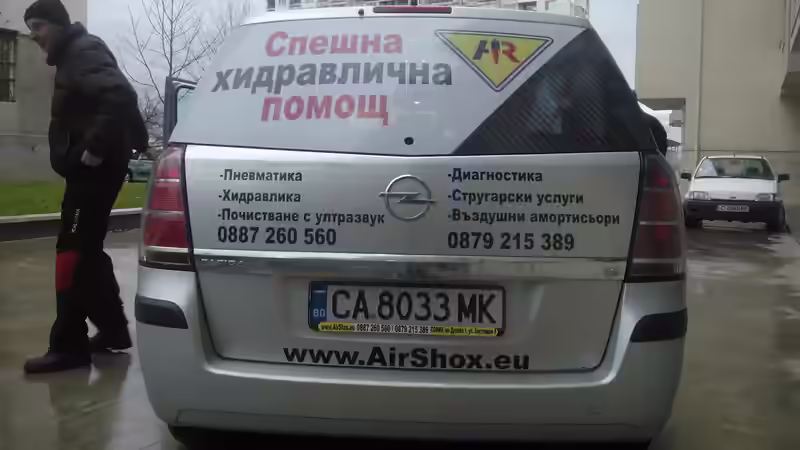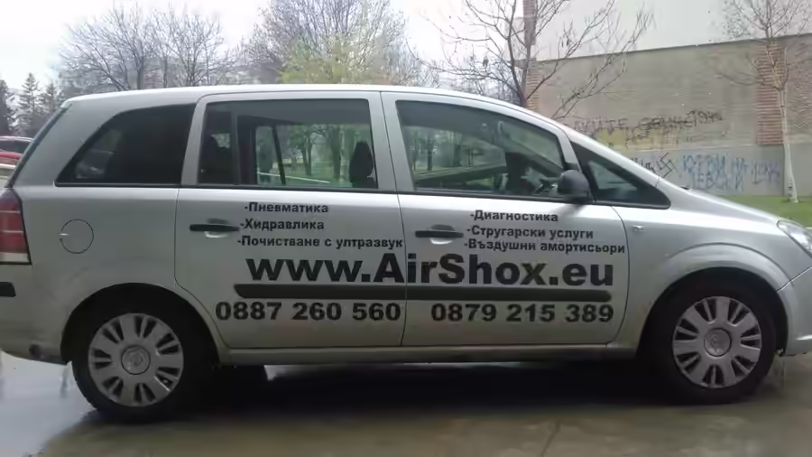 За Брандирането на фирмен автомобил е вид транспортна реклама, с която всички участници в движението се ориентират за вас и вашатадейност. За фирмените нужди на един автосервиз бе брандиран автомобил с фирменото лого и надписи за дейността на автосервиза. Задължително условие бе да се изпишат с големи цифри телефоните за контакт. Тъй като фирменото превозно средство е винаги в движение, изложено на лоши атмосферни условия, на въздействието на химиите, с които се чисти пътя през зимата, тези положения трябваше да се вземат предвид при избора на фолио за облепване. За да бъде рекламата устойчива, трябва фолиото да бъде с високо качество. Автомобилното(каст) фолио има характеристики, които го правят издръжливо на тези екстремни условия. То добре приляга към равни или умерено извити повърхности. Отлично е за изрязване на букви и всякакви графики. Разполага с широк набор от цветове за апликация. Безцветният лепилен слой е най-подходящ за апликиране върху гладки повърхности или стъкла. Повърхността на самия материал е гланцова или матирана, което придава на апликациите отличен външен вид. На брандиране с надписи бяха подложени задната и страничните врати, както и предният капак на колата. Надписите са с черно фолио, което да контрастира на белия цвят на автомобила за лесно разчитане. На предния капак е апликирано логото и фирмен знак на автосервиза, а на страничните врати информация за услугите ,които фирмата предлага. На фолиране е подложено и задното стъкло на превозното средство. Частично е облепено със затъмнящо черно фолио, както и с фолио за стъкла в бяло, върху което са отпечатани надписи и фирмения знак в различни цветове . Автомобилните фолиа за стъкла отговарят на изискването за видимост на шофьора и служат за спиране на притока на пряка светлина в купето и намаляване на температурата през горещите летни дни, освен за нуждите на рекламната стратегия. Затова фолирането на автомобилния парк е важен елемент от стремежа на всяка фирма да изпъкне пред конкуренцията, осигурявайки си заедно с това комфортни условия за работа.