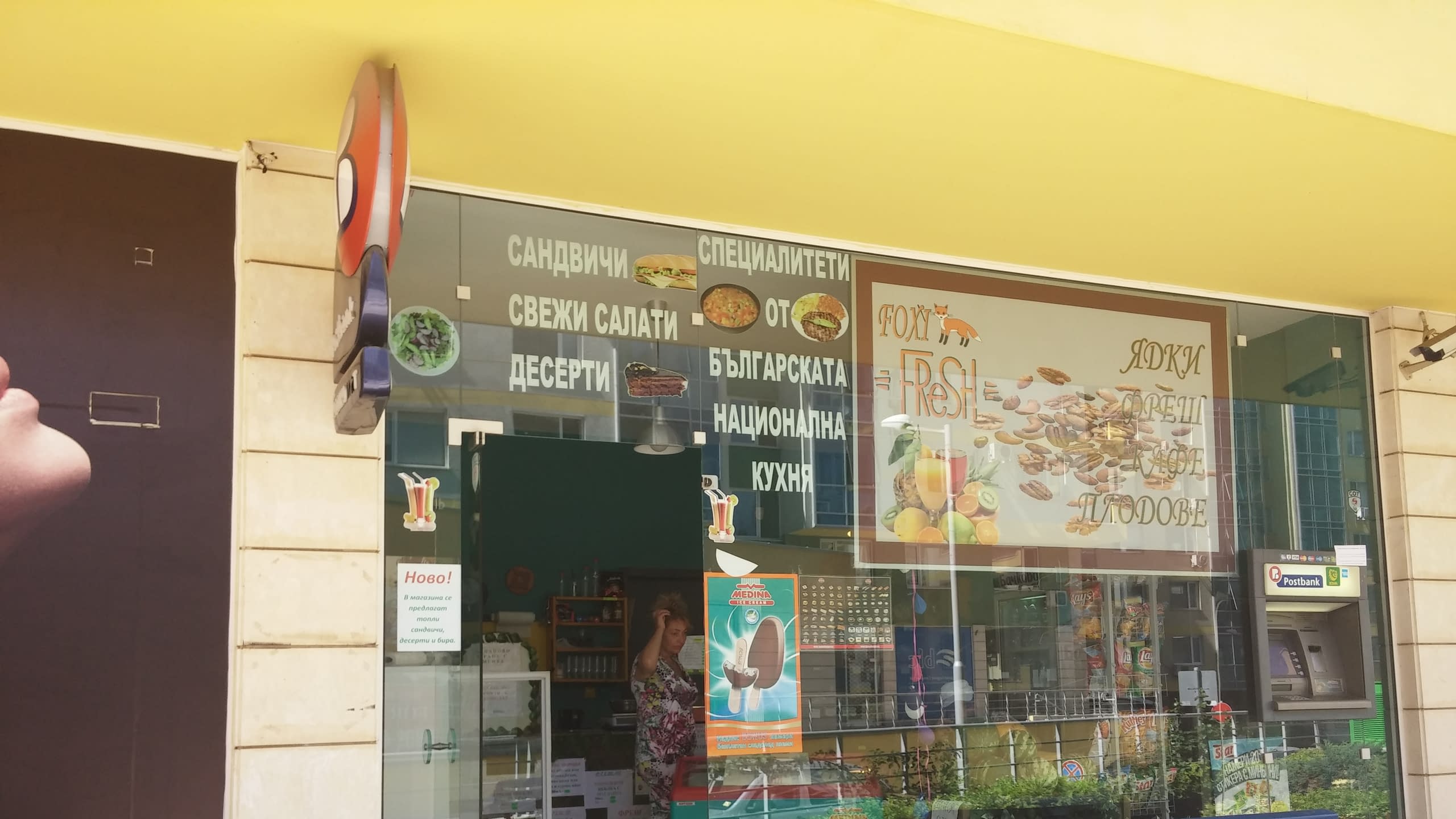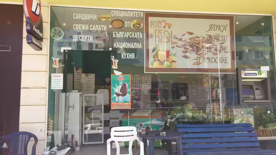 За вече разработен търговски обект – магазин за фреш, трябваше да се изработи реклама, която да указва, че магазинът разширява дейността си. Направени са надписи с фолио, от които става ясно, че в магазина ще се продава и пакетирана храна, сандвичи и десерти. Чрез рязани рекламни надписи, на клиентите се съобщава за новостите в търговския обект. Изрязването на надписи от цветно фолио е най-подходящия начин за такъв тип рекламни съобщения, които се добавят допълнително, тъй като самата технология е бърза, ефектна, бюджетна и много прецизна заради новите машини за рязане на фолио, които масово се използват в рекламната индустрия. Това са плотерите, режещо -печатащи машини, създаващи бърза и фино изработена продукция. Някои машини могат да изчертават шаблони, тоест събрани са двете функции- изрязване и разчертаване, както и печатане и изрязване при друг вид плотери.. Материалите – фолио от различен вид и клас, както и разнообразни мастила също са в голямо цветово разнообразие и на ниска цена и така готовият рекламен продукт няма от какво да бъде оскъпен. Рекламни надписи могат да се поставят на всеки търговски обект, след като на него вече са поставени други рекламни материали. Различните цветове фолио, шрифтове текст или изображения, които се отпечатват, позволяват да се съчетаят успешно старите реклами с новите, както цветово, така и стилово, за да се постигне търсеният рекламен ефект. В представената реклама надписите са съчетани с печатани цветни табели от фолио за стъклената витрина, с което се създава търсен контраст на рекламното послание. Той е лесно забележим от клиентите.