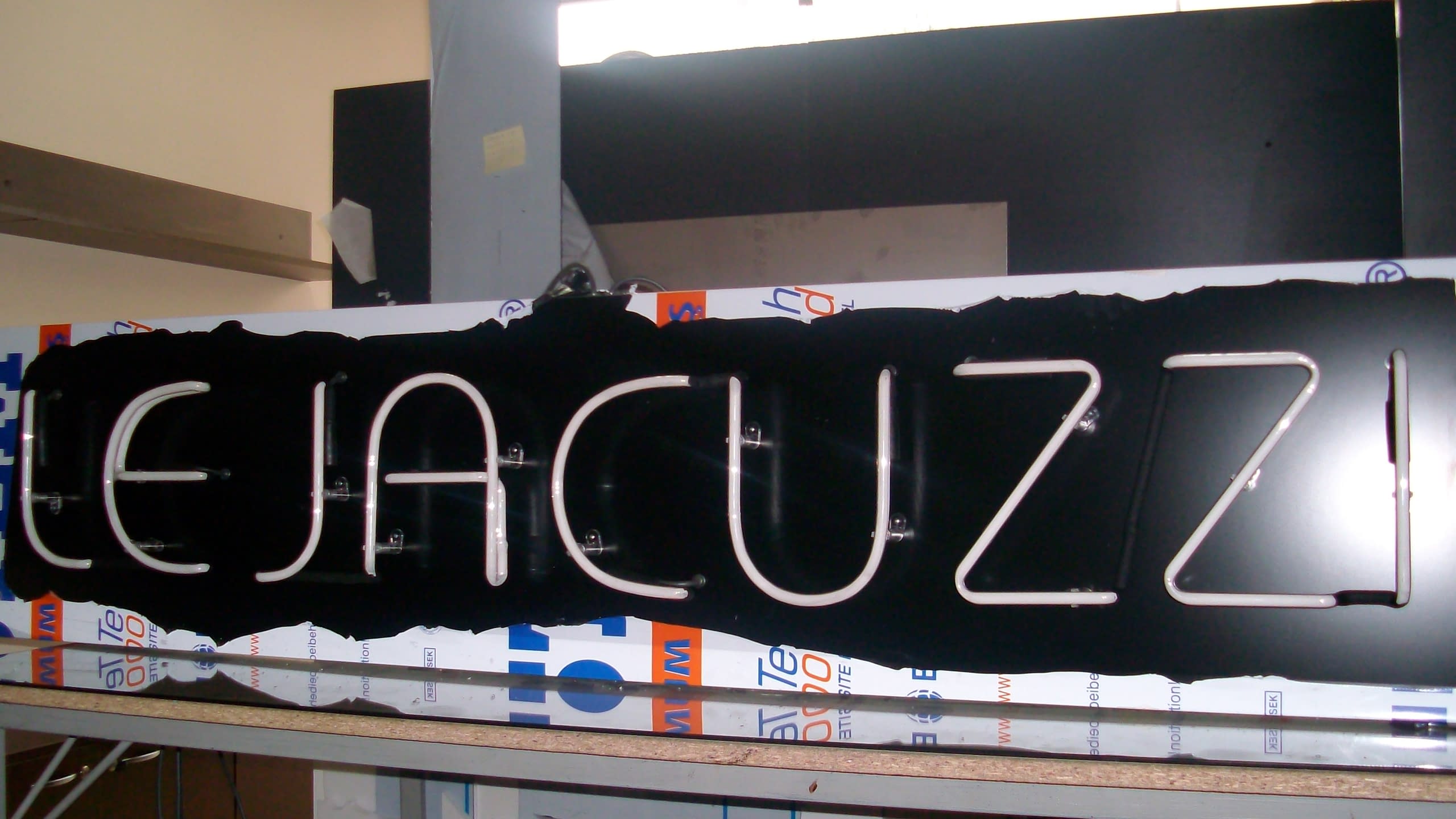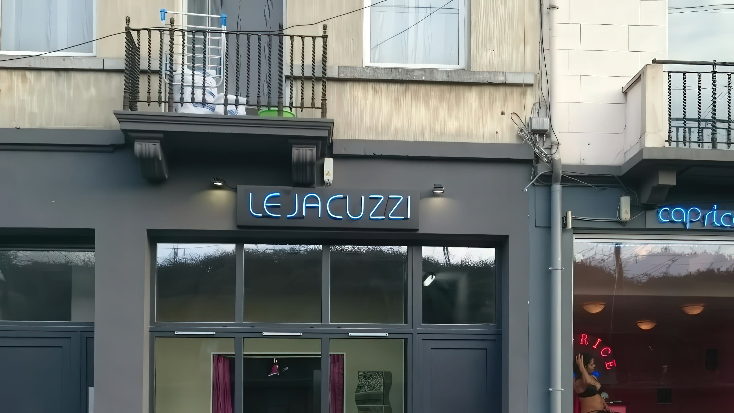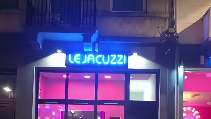 Надпис LE JACUZZI, светещ в наситено синьо, заснет в близък план с отражение на светлината върху повърхността под него.