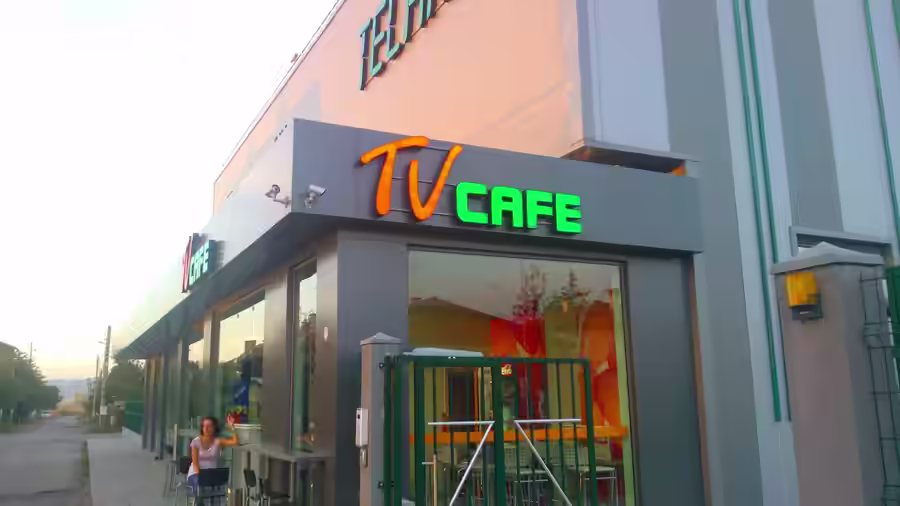 Външен изглед на сграда с надпис "TV CAFE" от обемни букви в оранжево и зелено, заснет през деня.