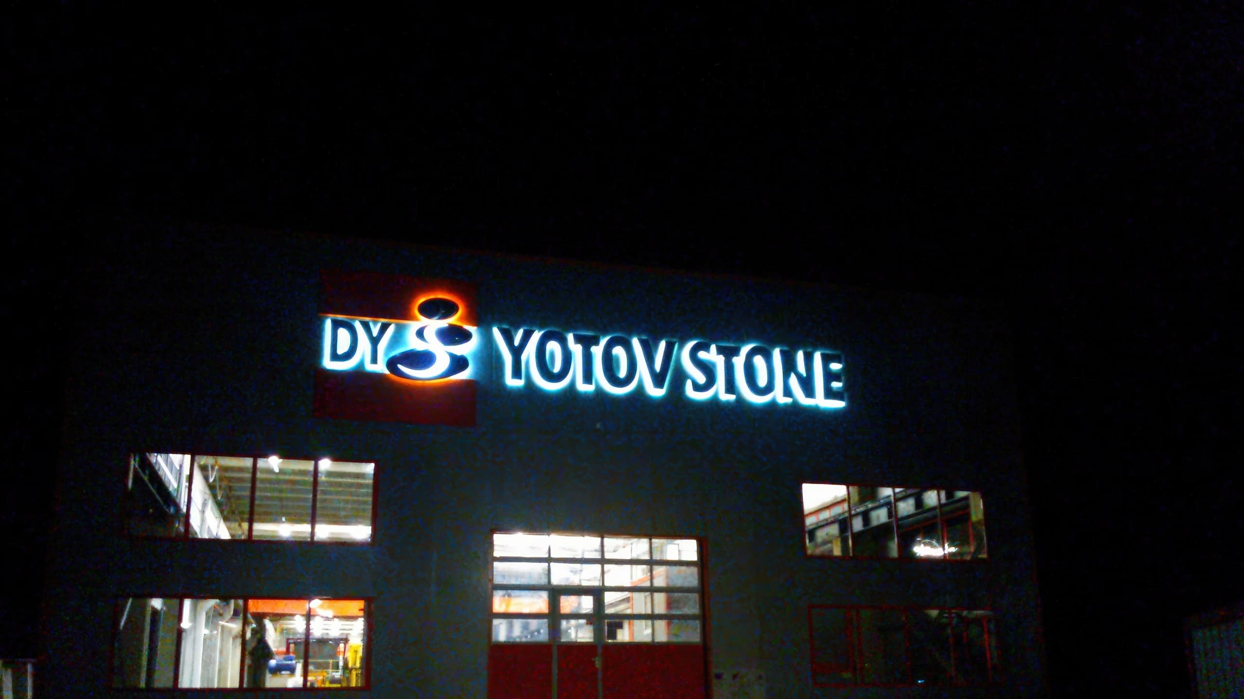 Рекламните агенции, които изработват рекламни продукти, се грижат клиентите да получат най-представителната реклама, която ще осигури просперитет на бизнеса им. Изборът обикновено пада на светещите реклами с обемни букви като част от маркетинговата стратегия за изграждане на печеливш имидж. От голямо значение е целият процес по изработката – от дизайна до монтажа, да се извърши от професионалисти. Материалите, необходими за изпълнение на всеки проект, трябва да са с високо качество, което е определящо за безпроблемната и продължителна експлоатация на рекламния продукт. Обемните букви могат да бъдат изработени от плексиглас, плексиглас и алурапид, инокс, коматекс, алуминий, тип сандвич и много други. За наш клиент в Мездра бе изработена и монтирана голяма светеща реклама Йотов стоун. Фасадната реклама е изработена от алуминий. Светенето на обемните букви е насочено към стената. Такова светене се нарича контражурно (задно осветяване). Елементите на самата реклама – обемните букви, са изрязани от алуминиеви профили на машина за рязане на алуминий. След това всеки един елемент е обработен ръчно, за да се получи точно определено качество на детайла с необходимия за целта на рекламата силует. Следваща стъпка е обагряне на буквите, придаване на определен цвят. То може да стане чрез облепване с фолио или прахово боядисване. За рекламата на Йотов Стоун изборът падна върху прахово боядисване на обемните букви. Тъй като поръчката е за голяма реклама за фасада, която да бъде поставена на производственото хале на фирма за рязане на камъни, клиентът бе поставил условие камъните да присъстват в рекламния продукт. Идеята бе рекламната стратегия да бъде насочена пряко към клиентите на фирмата, тъй като изображенията ще кореспондират с дейността на компанията. За тази цел бяха изработени изображения на камъни от формован плексиглас и апликирани с фолио. За цялостната реклама бяха избрани материали, които са олекотени и в същото време здрави и устойчиви, тъй като са за външна реклама, която бе монтирана на фасадата на обекта Този факт предопределя да бъдат изложени на външни въздействия. Последната стъпка в изработването на самия продукт бе осветяването на рекламата. Осветяването бе решено с вградени диодни модули. След боядисване на светещите елементи – обемните букви, се извършва опроводяване на светещите модули, преди да се монтира рекламата на обекта. Светещият надпис от обемни букви свети с мека, отразена ореолна светлина, насочена назад, което прави надписа силно да изпъква нощем. Денем този ефект се постига с обема на самата буква, която е изнесена напред и прави буквите забележими. Камъните в рекламата светят с оранжева светлина, която идва от мощните светодиоди, вградени в логото. За да се постигне подходящият начин на монтаж на рекламата, всяка буква предварително е подготвена, като е поставено краче, с което тя се дистанцира от стената, за да може светлината да пада назад зад буквата и да се разпръсква около нея като ореол. Всеки един елемент от светещата реклама предварително е очертан на шаблон от хартия и по този начин се намира точното му място по време на монтажа. Резултатът от рекламата е поразителен най-вече през тъмната част от денонощието, когато цялата реклама засиява в ярко оранжево и нежно синьо. Този проект е нагледно