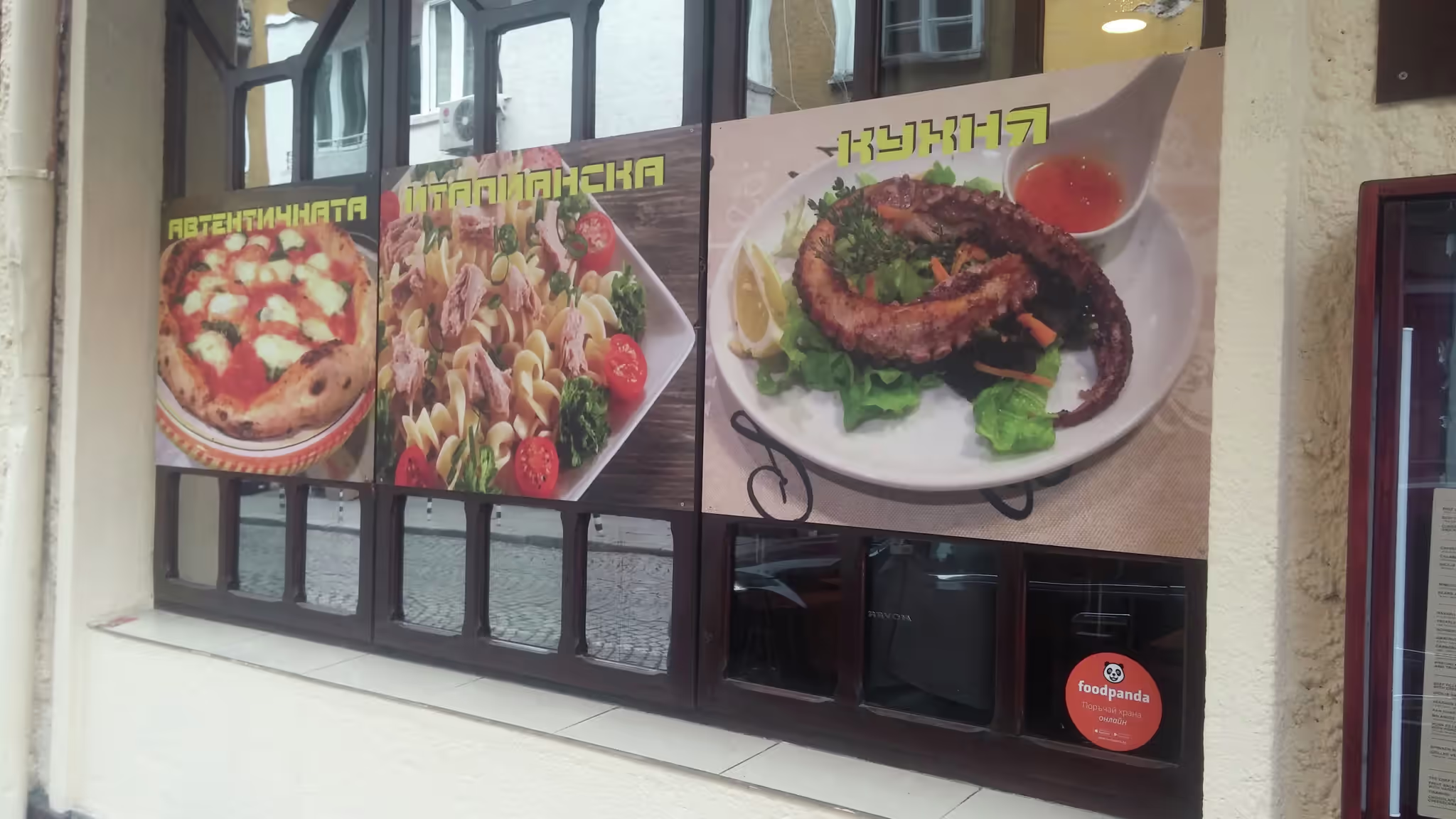 Кое отличава един ресторант, погледнат отвън, от околните сгради? Табелата, разбира си. Или по-точно табелите, защото по правило те са повече от една. Това не е каприз на собственика, а необходимост. Табелите имат задачата да уведомят клиентите за наличието на такова заведение и да представят кухнята, която се предлага по възможно най-впечатляващия начин. Затова изготвянето на такива табели е проект, който дава възможности за креативност. За наш дългогодишен клиент, собственик на италиански ресторант, бяха изработени рекламни табели с изображения на различни италиански ястия за ресторанта му в центъра на София. Самите табели са от материал, подходящ за външни условия, който е фолиран с фолио с пълноцветен печат и ламиниран за допълнителна защита. Пълноцветният печат гарантира постигане на изключително качествени изображения и има много технологични възможности: