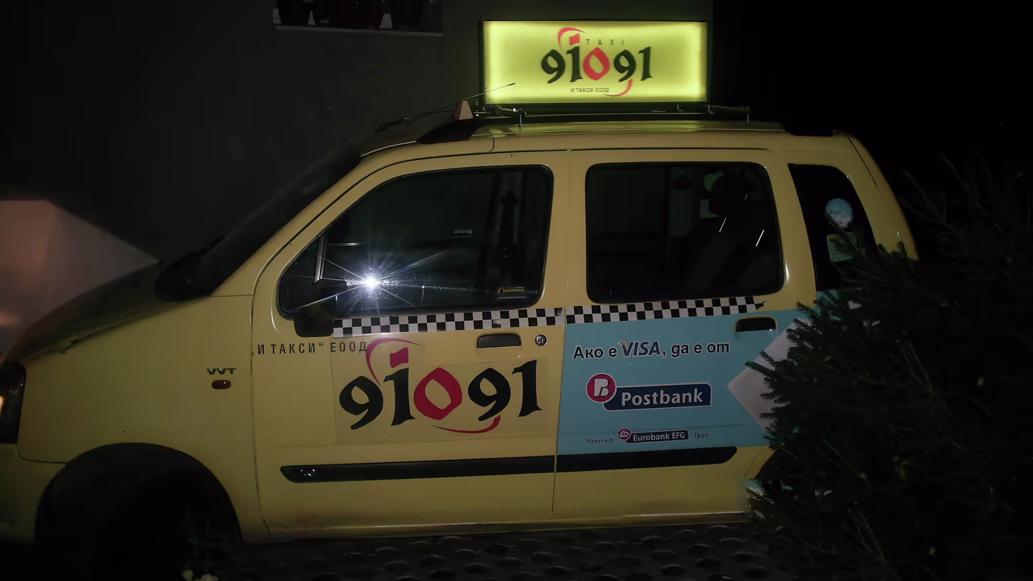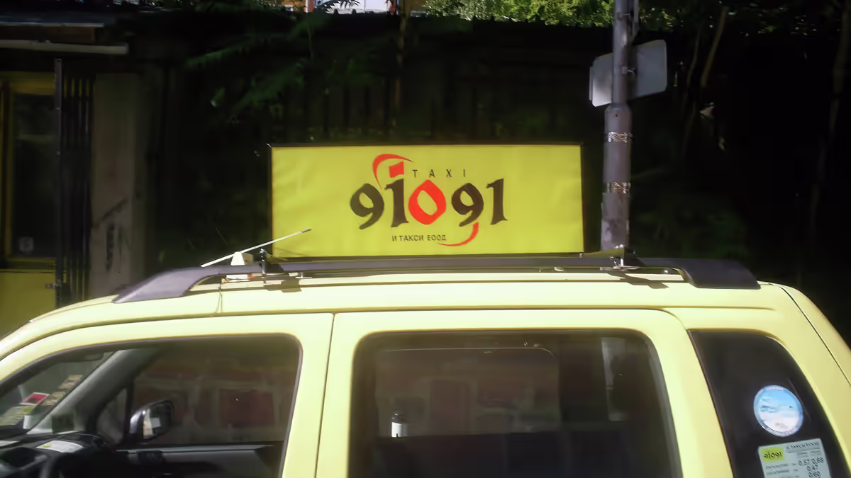 Реклама върху автомобил – жълто такси със светеща жълта табела на покрива с номер „91091“ и логото на И Такси ЕООД.