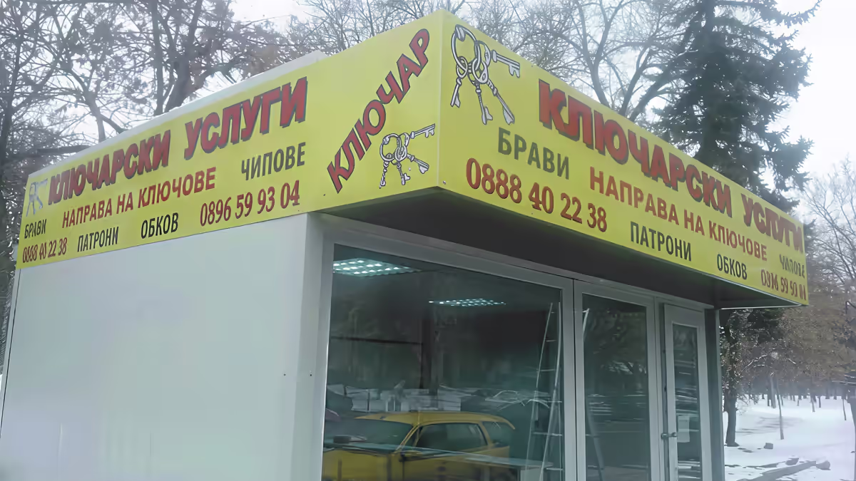 Никоя търговска дейност или услуга не могат без рекламен надпис, който да ги представи пред потенциалните клиенти. Табела или рекламен надпис е въпрос на избор, който зависи от спецификата на рекламираната услуга или търговска практика. За наш клиент бяха изработени рекламни надписи за ателие за ключарски услуги. Рекламният продукт представлява външна рекламна табела с надписи и изображения, указващи извършваната услуга. Продуктът за реклама е изработен от еталбонд – композитен материал, характеризиращ се с изключителна здравина и устойчивост на външни влияния. Освен това бондът е с отличен външен вид, което придава на изработените от него рекламни стоки елегантна и стилна визия. Върху основата от еталбонд е апликирано печатано фолио с изображения, подсказващи дейността на обекта и надписи. За да са видими надписите от всички страни, табелата е изработена от три части, които са монтирани на фасадата и на страничните стени на сградата. За тази цел е монтирана метална конструкция на подпокривното пространство, върху която е поставена табелата. Плоскостта от еталбонд е апликирана с фолио в жълт цвят върху което са отпечатани надписите и изображенията в контрастни цветове – червено и черно, за да са ясно видими и четливи. За да се запазят дълго време цветовете непроменени, върху принтираното фолио е поставен ламинат. Изработеното и монтирано изделие е завършено с помощта на завършващи елементи(винкели), така че да се запази общият тон в представянето на рекламата. Рекламният продукт изисква минимална поддръжка, което е още едно предимство, което прави рекламата отлично решение за представяне на индивидуален тип дейност, каквато са ключарските услуги. Еталбондът се използва като защитен материал при архитектурни фасадни облицовки, така че изборът като материал за реклами, поставени на стените на обекти, дават възможност да се защитават тези пространства от външни влияния, което е допълнително предимство при избор на материал. Лесната употреба, възможността да се предават всякакви форми и размери и естетичната и гладка структура са гаранция, че рекламата ще бъде дълготрайна и с отлични характеристики.