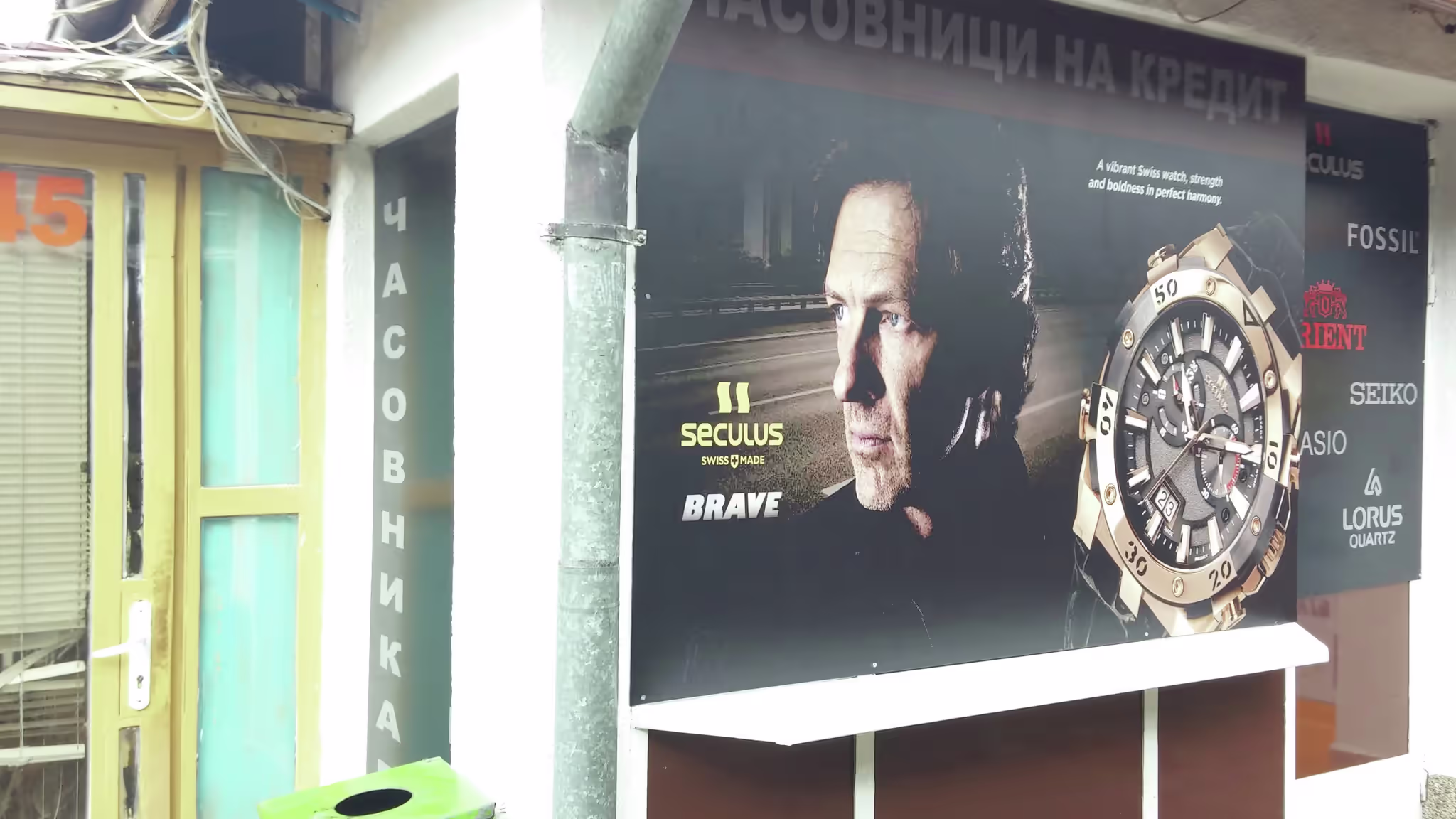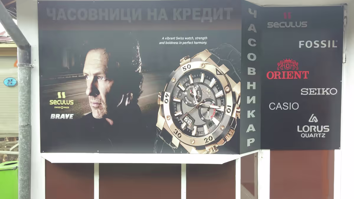 Всяка фирма с предмет на дейност рекламни продукти, най-често изработва рекламни табели от несветещ тип. Те са търсени много, защото са бързо и бюджетно решение за външна реклама. Табелата, която представяме на вниманието Ви, е с безупречна линия, приятна визия и отлични показатели по отношение на здравина и устойчивост. Това е постигнато чрез използване на правилно подбрани материали за изпълнение при тази рекламна площ. За основа е използван композитен материал. Композитите не се влияят от външни атмосферни условия и се отличават с устойчивост на неблагоприятни въздействия. Това се дължи на основната им характеристика – направени са от два или повече съставни материала с различни свойства, като новият материал съчетава качествата на съставните и се отличава най-вече с якост и лекота, което му дава неограничено поле за приложение. Изображението е направено с помощта на фолио, на което е нанесен печат. Техниката на печатане с пълноцветен широкоформатен печат е много подходяща при апликиране на табели за външна, а и за вътрешна реклама, защото разполага с предимства като бърза изработка, достъпна цена, издръжливост на външни условия. Самото изображение е с фотореалистично качество, когато се използва висока резолюция на печат и качествени медии и мастила. Тази техника е подходяща и при фолиране на витрини, брандиране на автомобили, за декорация и много други приложения. На представената рекламна табела е положен и защитен слой ламинат, с който се предпазва печата на картинката от избледняване. Това е водещо условие при изработката на рекламната табела, изпълнена за външна реклама. Логата на марките часовници, които са поставени, са изпълнени от рязано цветно фолио, със спазени строго размер и шрифт на марката, както и запазен цвят, разпознаваем за всяка конкретна марка. Цветовете, избрани за фон и за изображения и надписи, контрастират и това допринася за постигане на максимална яснота, с което рекламната табела се отличава, и привлича вниманието на клиентите към обекта.