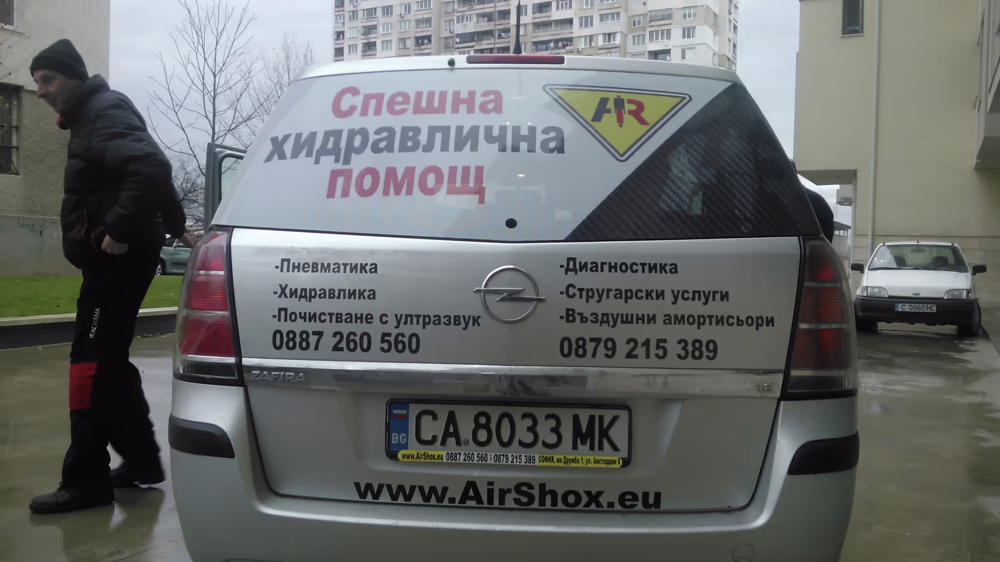 За Брандирането на фирмен автомобил е вид транспортна реклама, с която всички участници в движението се ориентират за Вас и Вашата дейност. За фирмените нужди на един автосервиз бе брандиран автомобил с фирменото лого и надписи за дейността на автосервиза. Задължително условие бе да се изпишат с големи цифри телефоните за контакт. Тъй като фирменото превозно средство е винаги в движение, изложено на лоши атмосферни условия, на въздействието на химиите, с които се чисти пътя през зимата, тези положения трябваше да се вземат предвид при избора на фолио за облепване. За да бъде рекламата устойчива, трябва фолиото да бъде с високо качество. Автомобилното(каст) фолио има характеристики, които го правят издръжливо на тези екстремни условия. То добре приляга към равни или умерено извити повърхности. Отлично е за изрязване на букви и всякакви графики. Разполага с широк набор от цветове за апликация. Безцветният лепилен слой е най-подходящ за апликиране върху гладки повърхности или стъкла. Повърхността на самия материал е гланцова или матирана, което придава на апликациите отличен външен вид. На брандиране с надписи бяха подложени задната и страничните врати, както и предният капак на колата. Надписите са с черно фолио, което да контрастира на белия цвят на автомобила за лесно разчитане. На предния капак е апликирано логото и фирмен знак на автосервиза, а на страничните врати информация за услугите ,които фирмата предлага. На фолиране е подложено и задното стъкло на превозното средство. Частично е облепено със затъмнящо черно фолио, както и с фолио за стъкла в бяло, върху което са отпечатани надписи и фирмения знак в различни цветове . Автомобилните фолиа за стъкла отговарят на изискването за видимост на шофьора и служат за спиране на притока на пряка светлина в купето и намаляване на температурата през горещите летни дни, освен за нуждите на рекламната стратегия. Затова фолирането на автомобилния парк е важен елемент от стремежа на всяка фирма да изпъкне пред конкуренцията, осигурявайки си заедно с това комфортни условия за работа.