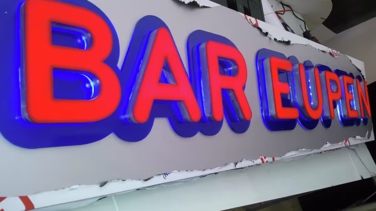 Рекламите с обемни светещи букви са луксозно изпълнение, каквато бе изработената реклама за бар за наш клиент в Брюксел. Рекламният продукт е изпълнен като кутия от композитен материал, изрязан под буквите. Композитният материал еталбонд, използван за кутията, се състои от алуминиеви листове и полиетиленова сърцевина, което го прави изключително твърд и стабилен, а едновременно с това лек и много подходящ за изработка на рекламни табели. Той е водоустойчив и огнеупорен, не се влияе от разликите в температурата. В подходяща комбинация с различни материали и креативен дизайн могат да се получат впечатляващи рекламни табели, които са с луксозен вид и на оптимална цена. Светещите кутии от еталбонд са забележителни с това, че свети само където е прорезът на лицето, тъй като еталбондът е плътен и не пропуска светлината. Рекламата за бар в Брюксел, Белгия, е изпълнена като реклама тип светеща кутия от прорязан еталбонд. Обемните букви са изрязани от дебело PVC на рутер фреза за твърди материали. Допълнително е залепен цветен плексиглас за лице. Подложката на обемните букви е от прозрачен плексиглас, за да пропуска светлината, с апликирано трансперентно фолио. Този вид фолио е светлопропускливо и игнорира отблясъците, които се получават, придавайки матов оттенък на надписа. Това го прави добре видим и четлив във всеки момент. Светлината преминава през прорезите за обемни букви и плексигласа от монтираните на гърба на кутията мощни LED модули и осветява рекламата. Ефектното светене на табелата за бар е в два цвята, като осветяващите модули са влагозащитени и с гаранция от производителя 3 години. Рекламната табела с обемни светещи букви е лека, елегантна и ефектна, в същото време е здрава и с дълготраен гаранционен период.